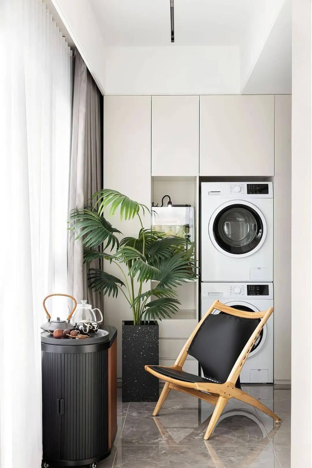 有的则走治愈松弛风,在柜旁布置绿植,让洗衣区充满生机,把家务变成享受;还有的融入现代极简风,用奶白色、浅灰色的无拉手柜体,搭配岩板台面,颜值与实用性拉满,适配各种装修风格。