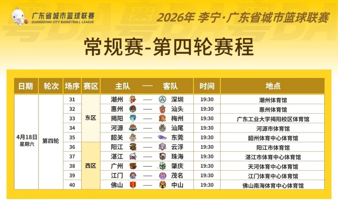 4月18日(本周六),粤BA常规赛将进行第四轮对决,10场精彩赛事将同步上演。其中,深圳队将做客挑战潮州队,中山队同样将在客场对阵佛山队;广州队将在主场迎战肇庆队,实力强劲的东莞队则将在客场对阵韶关队。