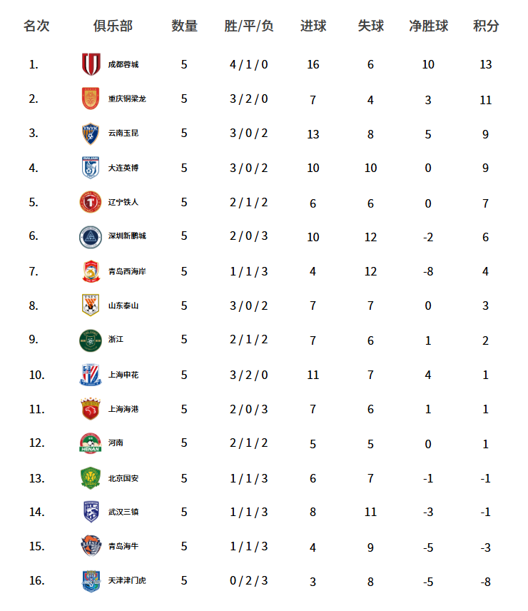在积分榜上,成都蓉城积13分继续高居榜首,重庆铜梁龙积11分紧随其后;云南玉昆积9分,以净胜球优势力压大连英博位居第三,本赛季中超联赛呈现出了罕见的“西南三强”格局。一胜难求的天津津门虎目前积负8分,继续深陷降级区;青岛海牛以负3分位居积分榜倒数第二,同样排在降级区。