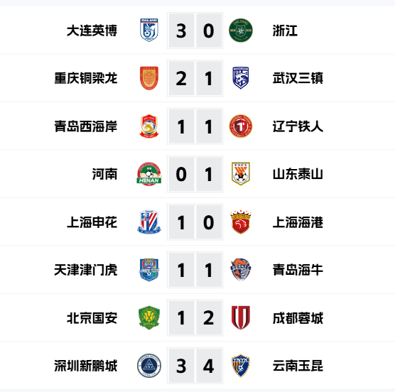 中超联赛第五轮赛果。图源:中国足球职业联赛联合会官网