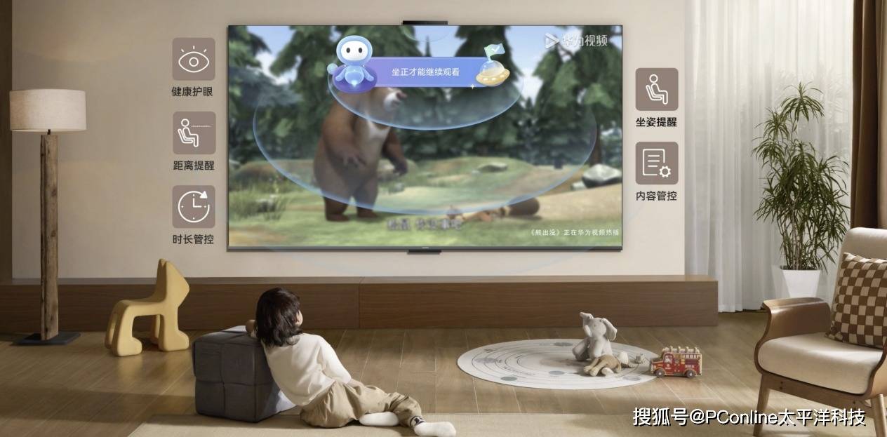 华为Vision智慧屏 6 SE通过德国莱茵低蓝光、无频闪、Youth Care三重护眼认证,其搭载的无频闪DC调光技术有效消除了屏幕闪烁,而低蓝光技术则从光源处减少了有害短波蓝光输出,双重技术协力,从根源上缓解视觉疲劳,长时间观看更舒适。针对儿童群体,它更具备行业少有的成长关怀能力,开启儿童模式后,AI摄像头会实时监测孩子的观看距离与坐姿,一旦出现趴坐、凑近、歪躺等不规范行为,便会自动暂停播放并提醒纠正,配合家长可在智慧生活APP设定的时长管控功能,从“被动提醒”变为“主动规范”,真正做到内容健康、用眼健康、习惯健康。