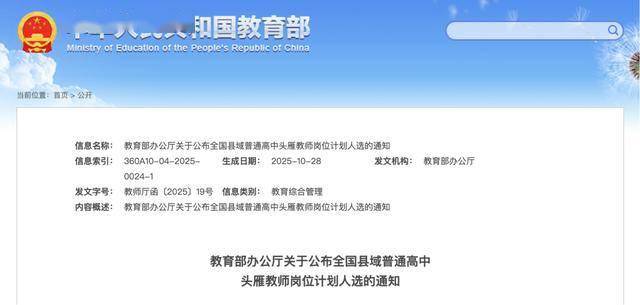 11月13日,教育部办公厅发布通知,确定首批全国县域普通高中头雁教师岗位计划入选教师600人。