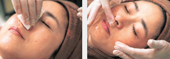 先涂上药剂,药剂中的TCA能够迅速活化肌肤,但如何能让其渗透进皮肤十分重要,需从下往上进行略微强劲的按摩。完成后将剩余药剂擦干净即可。