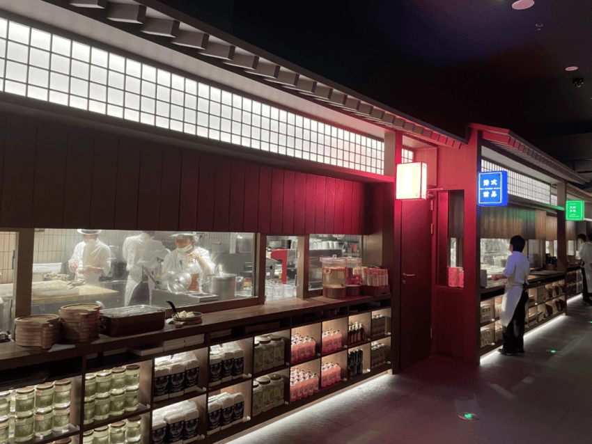 最让食客印象深刻的设计,是其在门店入口处设置的“明档长廊”。 对于常规餐厅来说,消费者进门后通常直接看到就餐区,厨房则被“藏”在后面。但庆春朴门却将整个厨房区打造成一个开放的“宋式市集”。