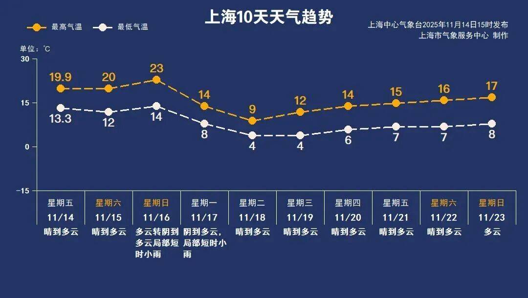 【周日晴好】明天(11月16日)白天多云为主,最高气温可上升至23℃,是近期高点。早间北部和西部郊区可能出现大雾天气,白天总体适合洗晒和出游。