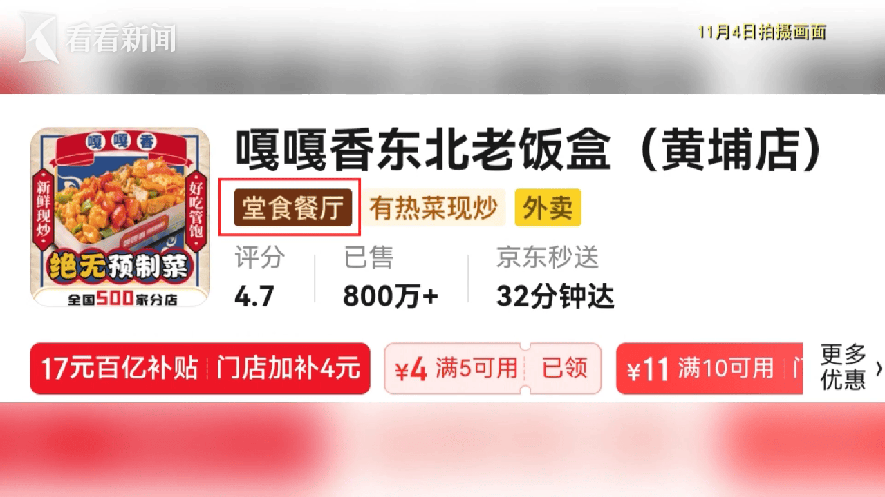 然而,肉眼可见的流量回报,也让不少只做外卖的档口,同样打起了“堂食”标签的主意。这家在三大外卖平台都很高分的东北菜,美团和京东都打上了“堂食”标签。而记者根据地址找到永寿路,却发现指向的美食城,集聚的全是没有堂食的外卖厨房,一路兜兜转转,最终在一条狭窄的走道旁,找到了这家“嘎嘎香东北老饭盒”。厨房一目了然,根本没有可堂食的桌椅,只有三位快递员坐在塑料货框上,围着一个纸板箱解决午饭。面对询问,工作人员含糊其辞:“就这‘小桌’可以吃饭。”