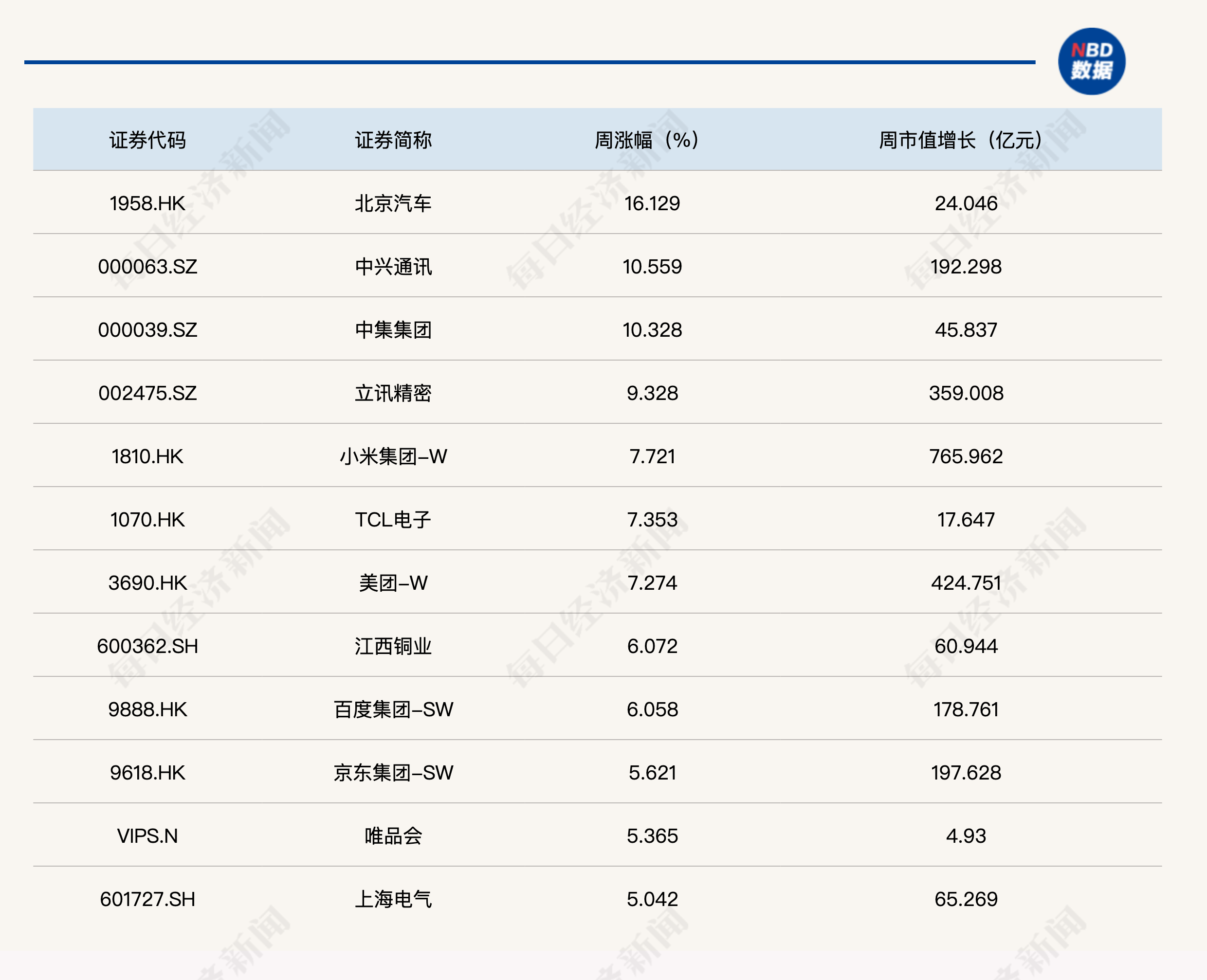成分股方面,北京汽车周涨16.13%,周涨幅最大;中兴通讯、中集集团的周涨幅均超过10%,表现抢眼;另外,立讯精密、小米集团-W、江西铜业以及唯品会等9只个股周涨幅也均超过5%。市值增长方面,小米集团-W和阿里巴巴-W的周市值增长均超过500亿元。