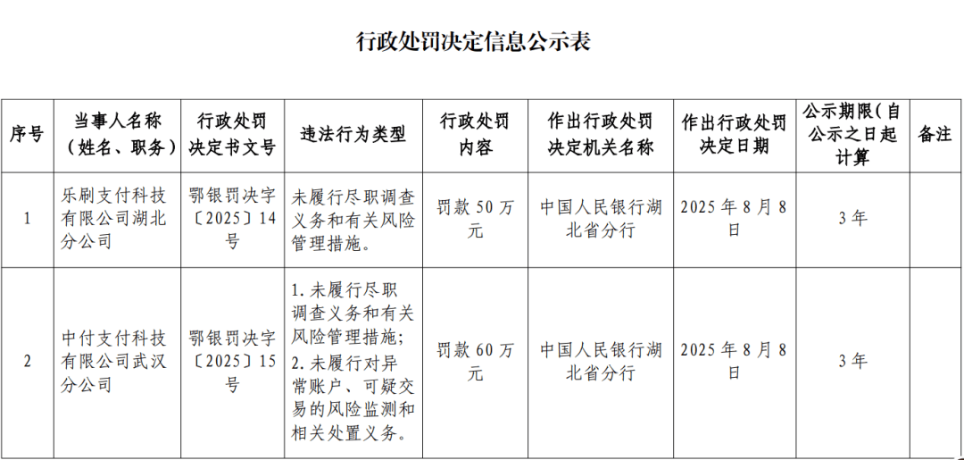 今年8月8日,乐刷支付科技有限公司湖北分公司因未履行尽职调查义务和有关风险管理措施,被中国人民银行湖北省分行处以罚款50万元。