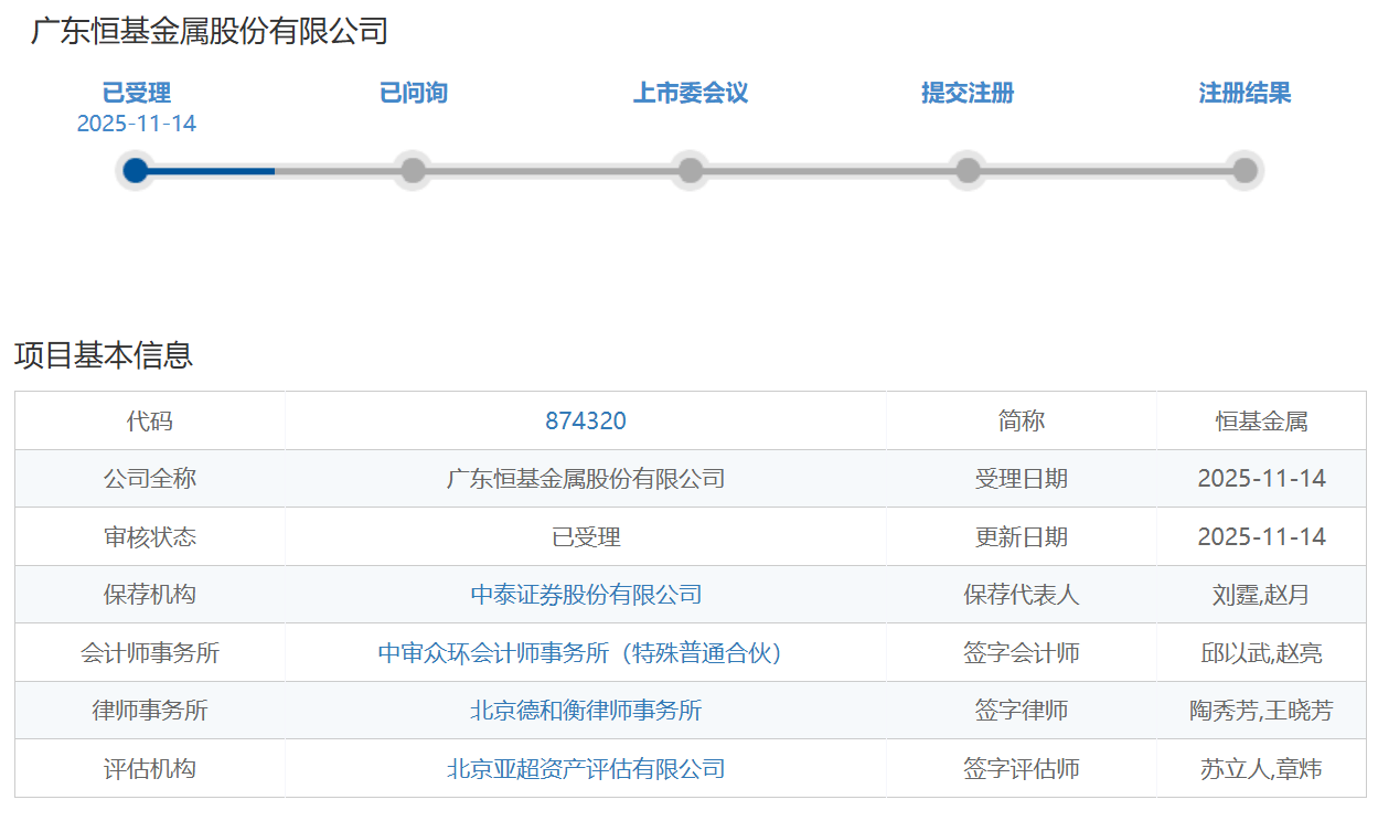 据北交所官网,11月14日,广东恒基金属股份有限公司(下称“恒基金属”)IPO申请获受理,保荐机构为中泰证券。