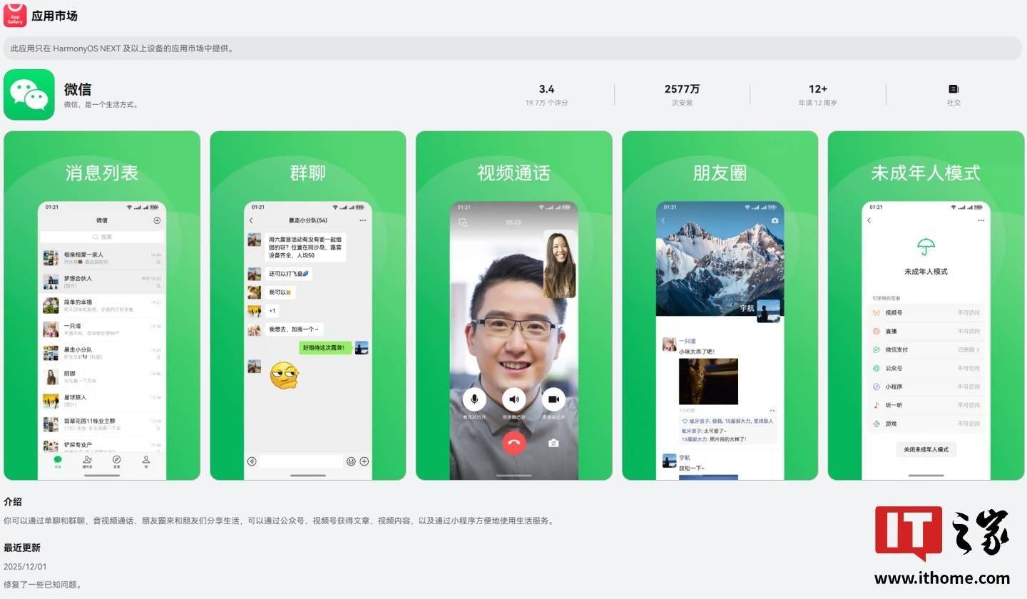 IT之家 12 月 1 日消息,微信鸿蒙版 App 今日推出了 8.0.13.33 正式版更新,包体大小约 370.1MB,更新日志显示为“修复了一些已知问题”。