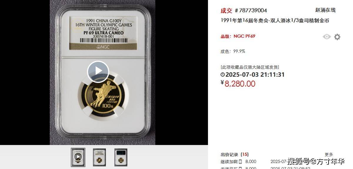 还有一枚更早的老币也值得说说——1991年发的“第16届冬奥会”滑冰金币,重三分之一盎司。今年7月初这枚币拍出了8280元。可您掂掂分量:三分之一盎司约合10.37克,光按金料算现在就值11176元。成交价只有料价的74.1%,相当于打了七四折。