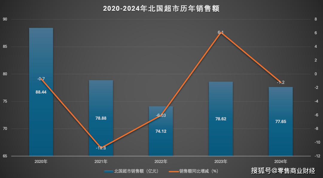从近五年数据来看,北国超市始终稳居河北省内连锁超市榜首,门店数从2020年的47家稳步增长至2024年的65家;但销售额从2020年的88.44亿元波动下滑至2024年的77.65亿元,与省内第二名信誉楼的差距持续缩小。