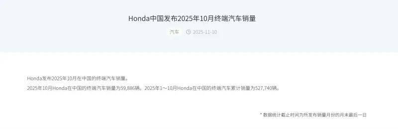 那时候的本田春风得意,肯定料想不到如今它在中国市场的窘境。时间回到现在,2025年,如今本田最新的月销量仅能维持在59886台,1-10月份,本田汽车在中国市场累计拿下了52.7万辆的成绩,按照这个趋势,本田今年的销量,将定格在62万上下,相比五年前,恰好少了100万辆。