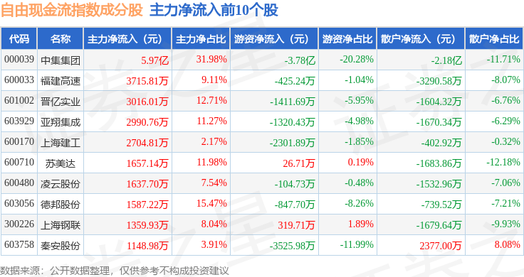 资金流向方面,自由现金流(980092)指数成份股当日主力资金净流出合计42.32亿元,游资资金净流入合计5.77亿元,散户资金净流入合计36.55亿元。成份股资金流向详情见下表:
