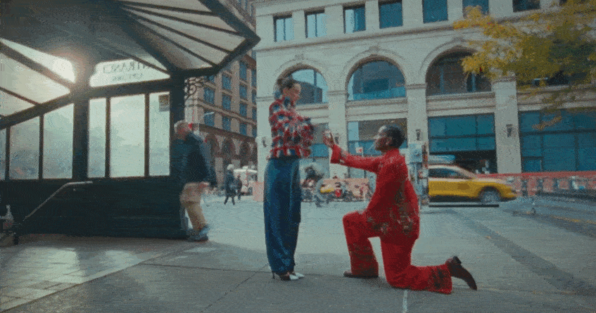 一路上,男主上演“卓别林式喜剧”,赶路途中穿过一家家店铺,购买新裤子和新西服。待女主出站时,男主精准跪在地铁口,奉上钻戒。