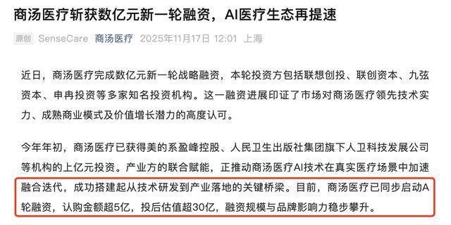 瑞财经 吴文婷 11月17日,商汤医疗宣布完成数亿元新一轮战略融资,本轮投资方包括联想创投、联创资本、九弦资本、申冉投资等多家知名投资机构。