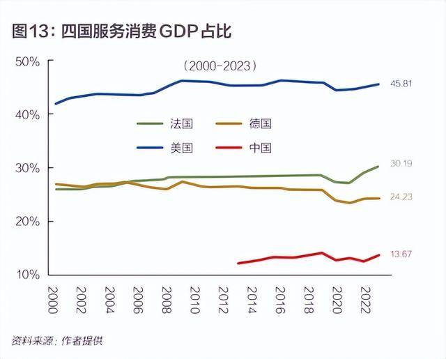 五是在居民消费包含的商品与服务消费中,服务消费不足问题更为突出,构成居民消费不足的主要矛盾。根据庄巨忠(2024年)对中国与十个经济体(美国、欧盟与六个周边经济体)研究,2018年-2019年中国居民最终消费中的商品支出占比与美欧日等发达经济体大体可比没有很大差别,服务消费占比与发达国家比较存在12个-20个百分点差异。刘世锦(2025年)整理国际比较数据显示,中国服务消费占比低于样本国程度,显著大于商品服务国际比较中较低程度。我们考察若干国家数据也发现,中国服务消费GDP占比偏低程度,显著高于商品消费的偏低程度。