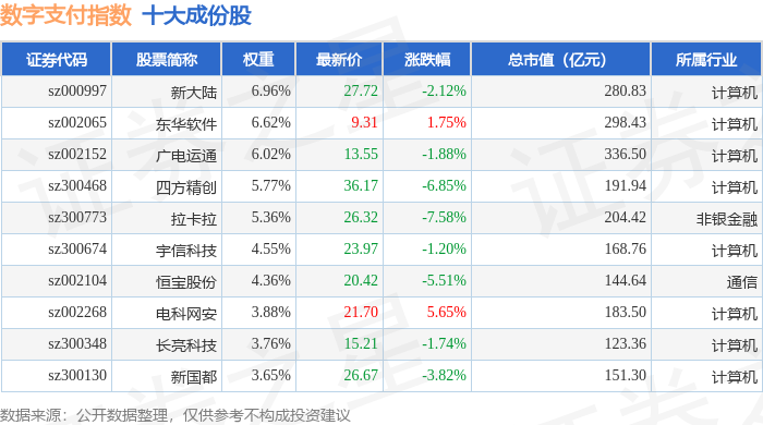 证券之星消息,1月5日,数字支付(980113)指数报收于1876.86点,跌0.82%,成交386.93亿元,换手率4.04%。当日该指数成份股中,上涨的有28家,复旦微电以12.59%的涨幅领涨,下跌的有20家,拉卡拉以7.58%的跌幅领跌。