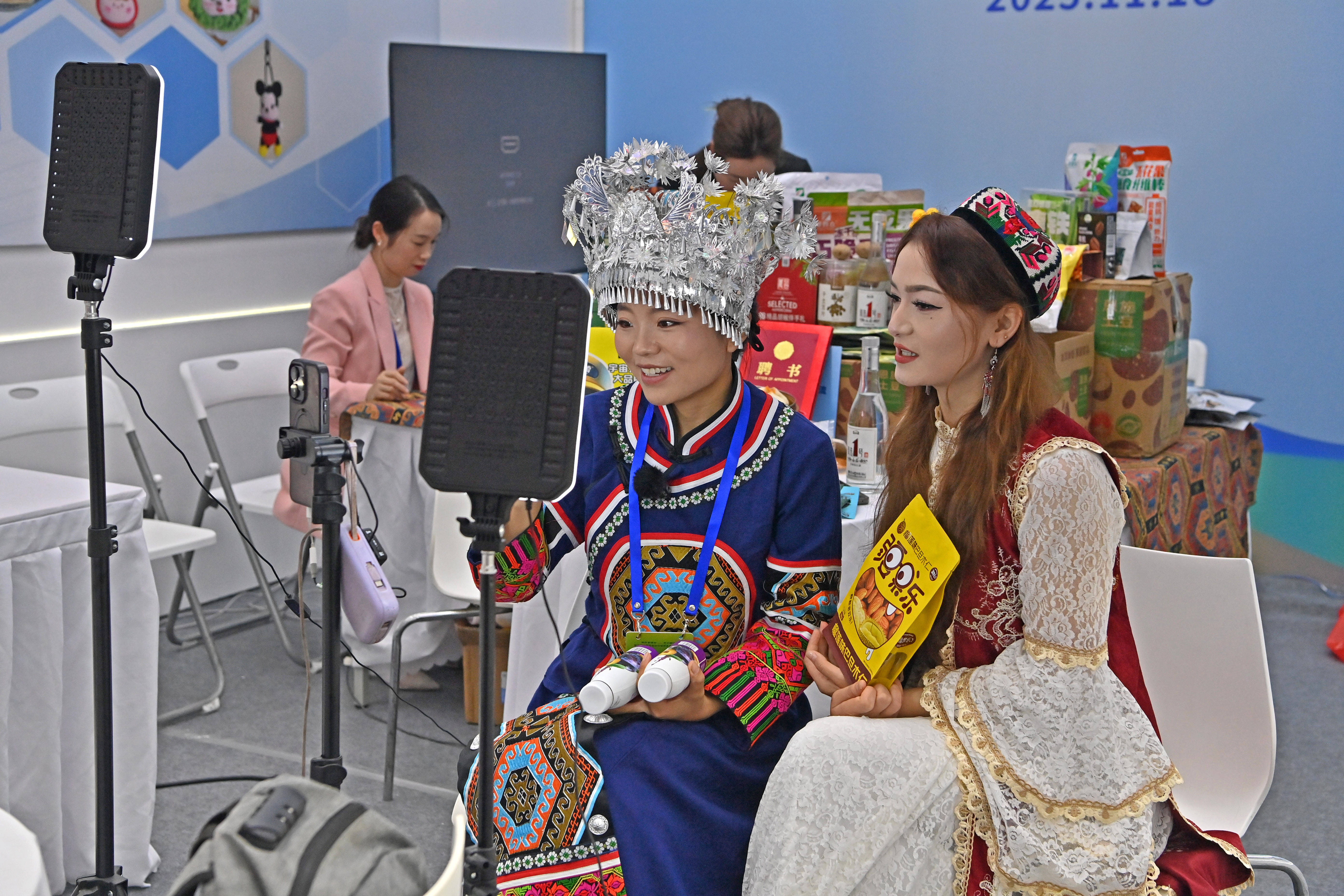 11月18日,网络主播在第三届全国劳务协作暨劳务品牌发展大会上直播带货。 新华社记者 周华 摄