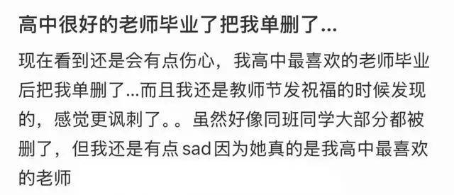 教师节那天,当满怀感激之情的祝福信息发送出去後,收到的却是一个冰冷的红色感叹号——帖主发现自己被曾经最喜爱的老师单方面删除了好友。