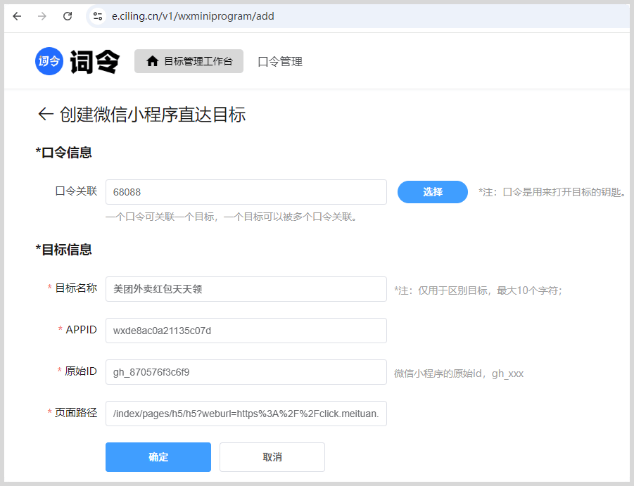 2.3、创建目标,选择关联口令,并输入微信小程序(APPID、原始ID、页面路径);