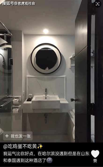 还有四川一名女性网友也跟帖发图表示:“我运气比你好点,在哈尔滨没有遇到,在山东和泰国遇到这种酒店。”看图片可以得知,的确是洗漱间的镜子太高了,导致四川女性网友只能照到自己的半张脸,而且还是穿着高跟鞋才勉强看到了自己的长相,不过太累了看起来。
