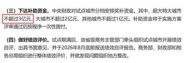 像北京、上海、广州、深圳等特大城市,每地最多可获一次性中央补贴资金不超过3亿元,不用分期到账,没有折扣。