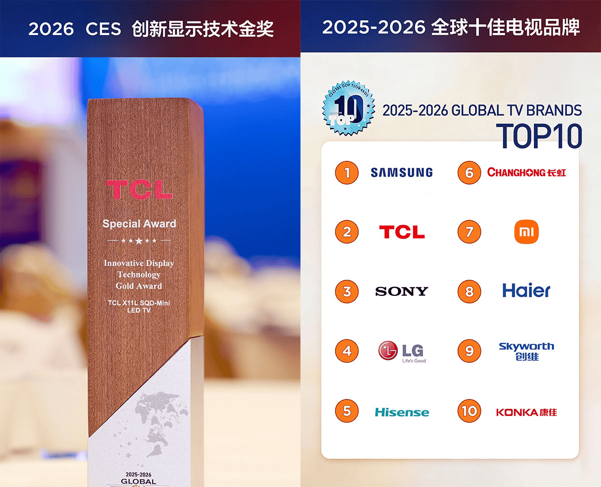 不仅是行业大佬都认可的好画质的终极答案,在最近的CES 2026中,还拿下了创新显示技术金奖等多项电视奖项。TCL也是因此被CES评选为全球第二佳、中国第一电视品牌!