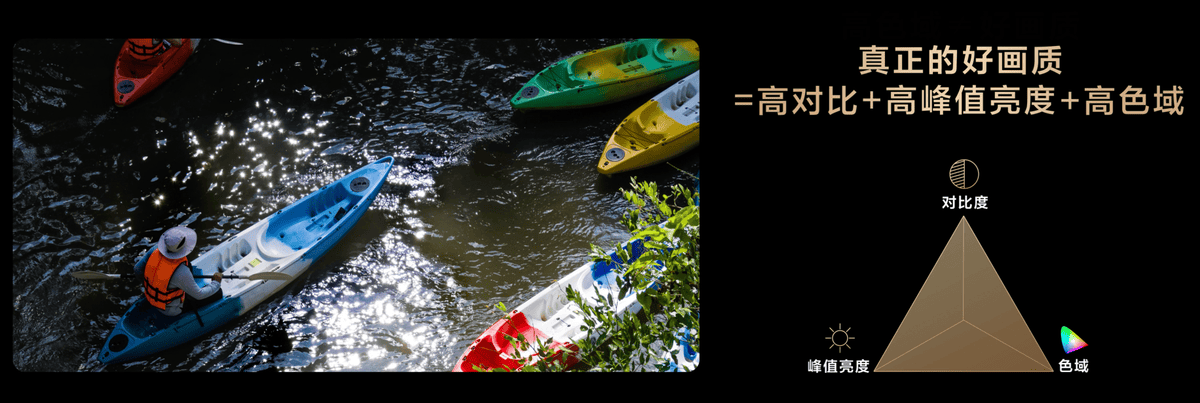 首先大家要知道,所谓的好画质不能由电视的单一参数决定的,比如只有高色域,没有足够高的亮度,画面就不够鲜艳;只有高峰值亮度,没有高对比度,画面就会显得刺眼没有层次感;只有高对比度,没有高色域,画面就会显得不够真实。