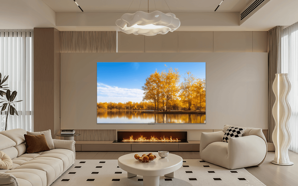 再说说我最看重的外观设计,它采用了极景.无黑边设计,屏占比接近100%,正面看过去就是一整块屏幕,沉浸感特别强。加之本身设计就特别纤薄,挂在墙上可以贴合紧密,放在电视柜上也不占地方,简约大气的设计风格刚好适配我家的装修风格。