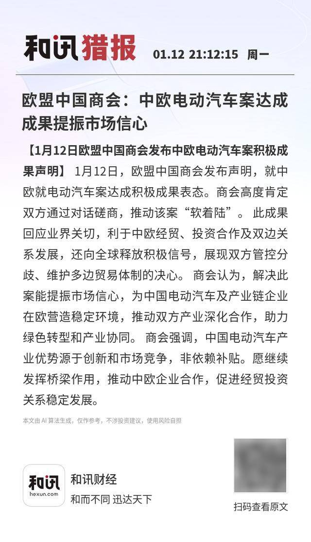 【1月12日欧盟中国商会发布中欧电动汽车案积极成果声明】1月12日,欧盟中国商会发布声明,就中欧就电动汽车案达成积极成果表态。商会高度肯定双方通过对话磋商,推动该案“软着陆”。此成果回应业界关切,利于中欧经贸、投资合作及双边关系发展,还向全球释放积极信号,展现双方管控分歧、维护多边贸易体制的决心。商会认为,解决此案能提振市场信心,为中国电动汽车及产业链企业在欧营造稳定环境,推动双方产业深化合作,助力绿色转型和产业协同。商会强调,中国电动汽车产业优势源于创新和市场竞争,非依赖补贴。愿继续发挥桥梁作用,推动中欧企业合作,促进经贸投资关系稳定发展。