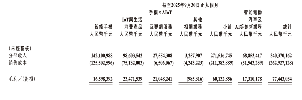 前三季度,小米集团智能电动车及AI等创新业务累计实现营收688.5亿元,累计实现毛利173.1万元,期内毛利率约为25.1%。