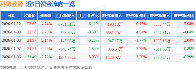 证券之星消息,截至2026年1月12日收盘,科德教育(300192)报收于23.65元,上涨4.74%,换手率14.59%,成交量47.36万手,成交额11.09亿元。