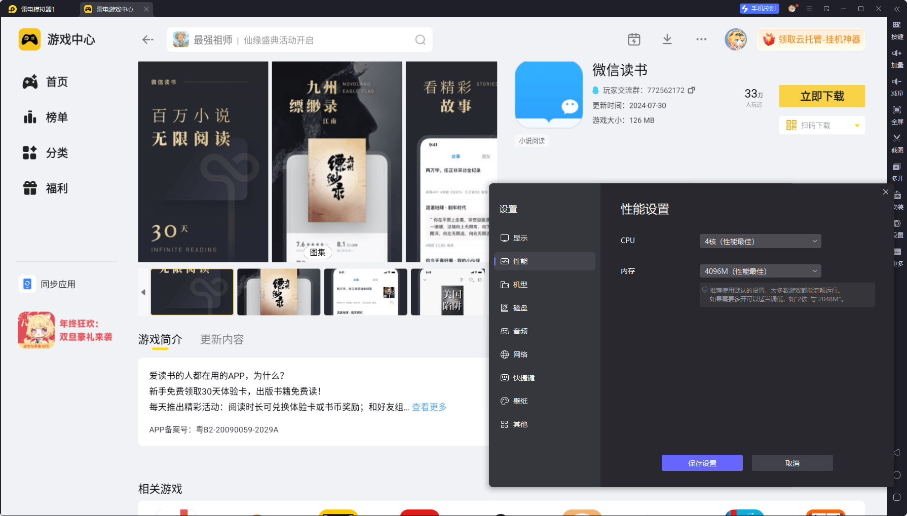 3. 资源占用更合理:在同等配置的电脑上,雷电模拟器运行微信读书时,对内存和CPU的占用相对较低,不会过多占用电脑资源,不影响电脑同时运行其他软件。