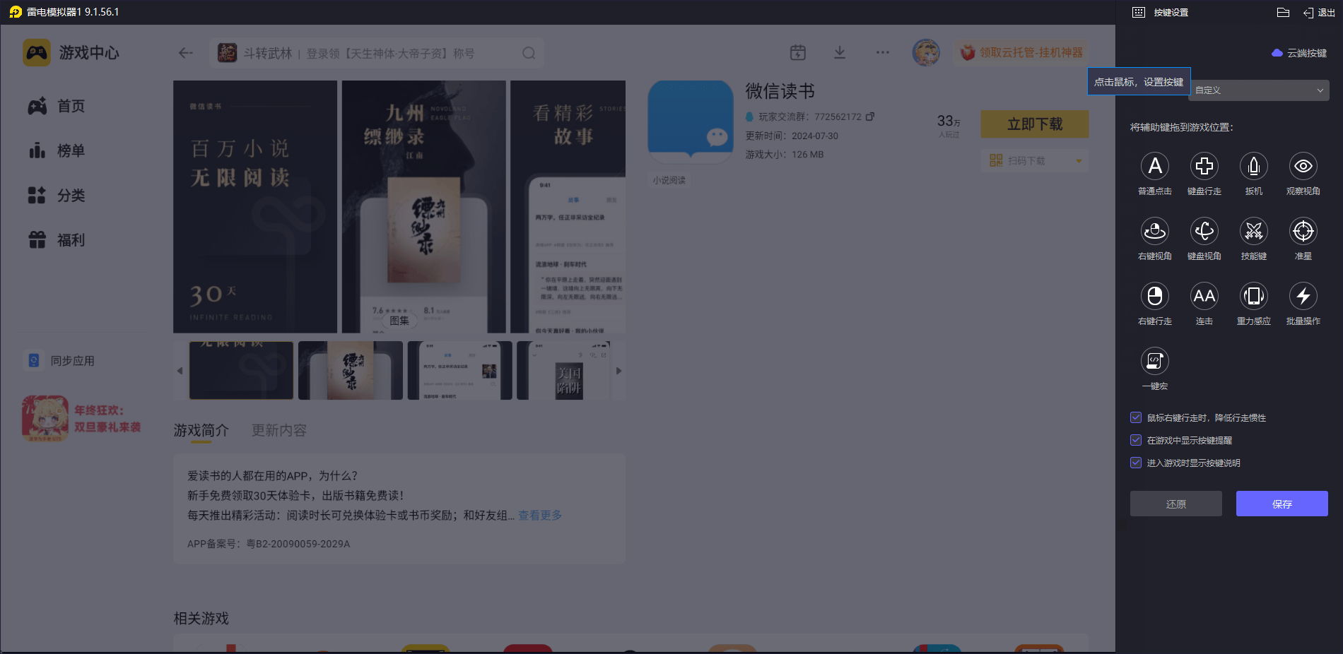 雷电模拟器安装包下载完成后,按照提示完成模拟器的安装操作。安装好之后打开模拟器,在桌面左侧的找到“雷电游戏中心”并点击进入。在游戏中心的搜索框里输入“微信读书”,搜索完成后,找到对应的应用图标,点击下载按钮,系统就会自动将微信读书安装到雷电模拟器的桌面,安装完成后点击图标就能启动使用。