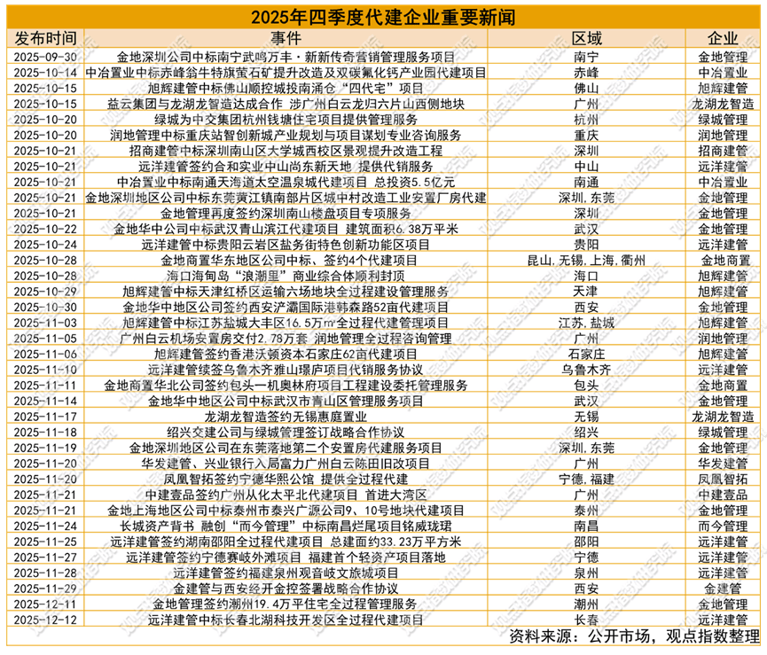 城市更新政策的持续推进为代建行业带来了显著的增量业务机会,跨界融合能力已成为企业抢占市场份额的核心竞争力。据观点指数不完全统计,当前绿城管理、金地管理等企业在住宅代建领域获取了较多项目,产业、商业代建的细分赛道存在较大的增量空间。这一现象既反映了市场对住宅代建的基础需求,也揭示了企业在商业、产业等复杂业态中的能力差异。