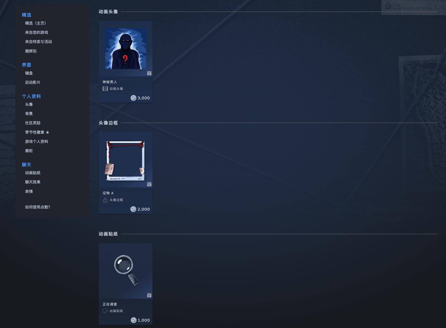 此外,Steam 一如既往地为活动上线了点数商店物品,涉及动画头像“神秘男人”、头像边框“证物 A”、动画贴纸“正在调查”,IT之家附点数商店地址(https://store.steampowered.com/points/shop/app/4130450)。