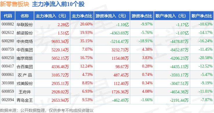 从资金流向上来看,当日新零售板块主力资金净流出7.54亿元,游资资金净流入1.62亿元,散户资金净流入5.92亿元。新零售板块个股资金流向见下表: