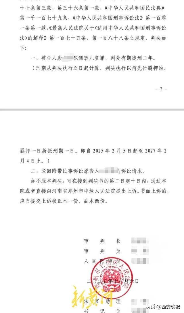 11月19日,新黄河记者从王女士处获悉,其7岁女儿被猥亵一案经郑州市上街区法院一审开庭审理后,于11月6日作出刑事附带民事判决书,判决殷某某犯猥亵儿童罪,判处有期徒刑两年等。