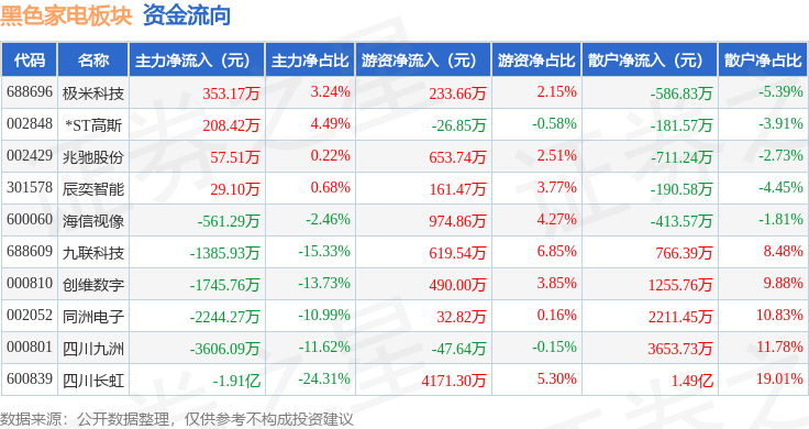 从资金流向上来看,当日黑色家电板块主力资金净流出2.8亿元,游资资金净流入7262.91万元,散户资金净流入2.08亿元。黑色家电板块个股资金流向见下表: