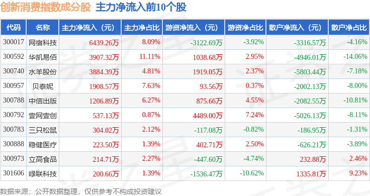 资金流向方面,创新消费(970041)指数成份股当日主力资金净流出合计16.96亿元,游资资金净流入合计4.33亿元,散户资金净流入合计12.63亿元。成份股资金流向详情见下表: