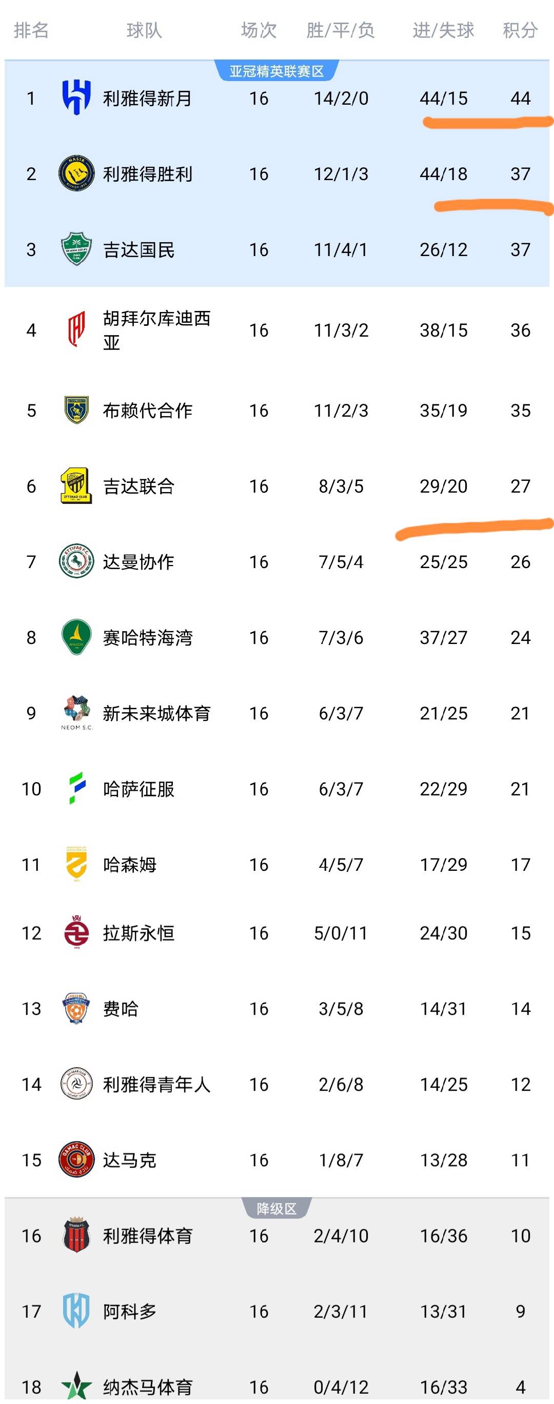 今天凌晨,沙特联第17轮结束了最后三场的较量,吉达联合、利雅得新月等队出战,这三场较量之后,沙特联所有球队都已经踢完了第17轮的比赛。沙特联积分榜随之更新,我们来看看。