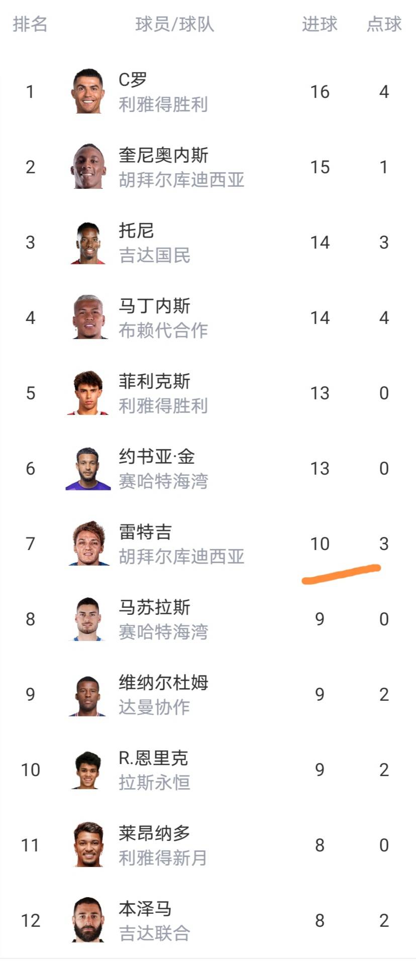 射手榜已经有7人进球上双,C罗以1球优势领跑,菲利克斯跌至第5,要知道之前菲利克斯可是领跑的,如今状态慢慢下来了。本泽马已经打入8球!