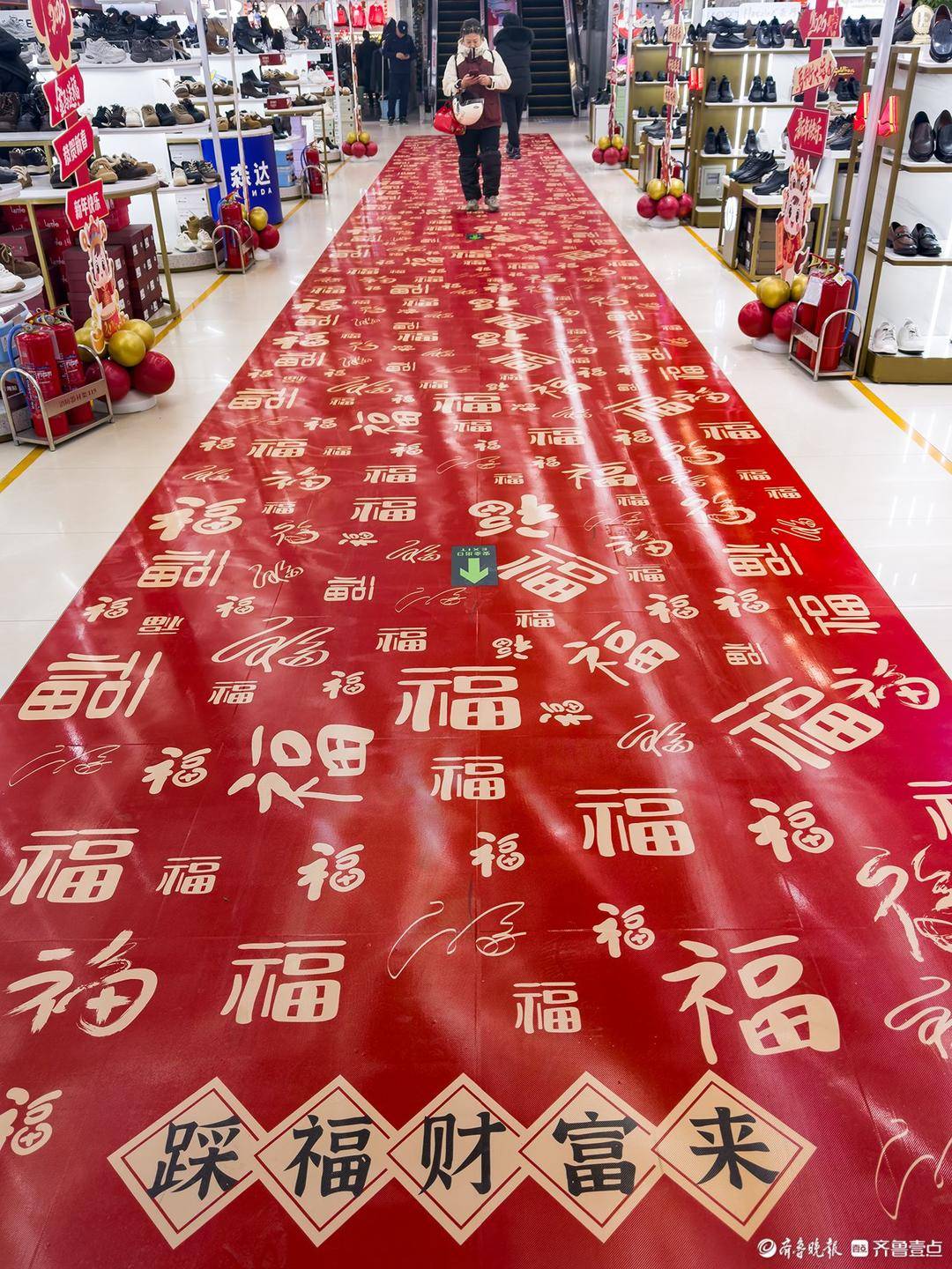 1月20日,济南银座奥特莱斯(七里山店)内,一条印满 “福” 字的红地毯贯穿全场,“踩福财富来” 的吉祥字样醒目呈现,顾客行走其间,在红火的节日氛围里提前感受马年新春的喜庆与福气。