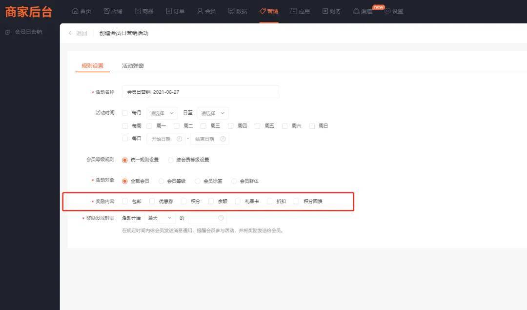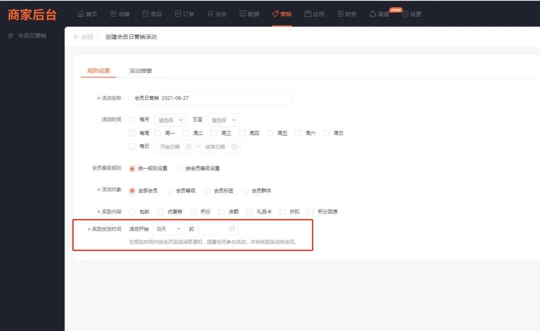 支持设置会员日当天或者之前7天的固定时间点自动为会员发放奖励。
