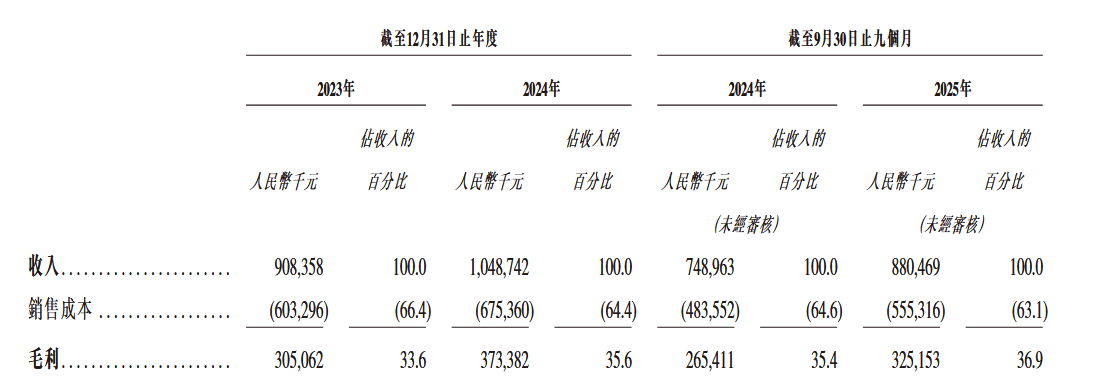 在供应商方面,2023年、2024年及2025年前9个月前五大供应商采购额占比分别为25.8%、21.1%及23.1%,最大供应商采购额占比保持在5.4%-7.5%区间。所有主要供应商均为独立第三方,不存在对特定供应商的过度依赖,保障了供应链的稳定性。