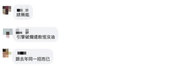 在侯汉廷帖文下方评论区,岛内网友批民进党“绿无能”。有网友表示,“引擎破烂还敢怪没油”“跟去年同一招而已”。