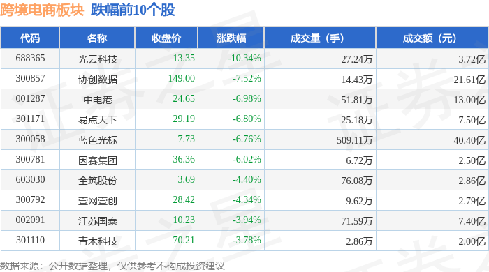 证券之星消息,11月14日跨境电商板块较上一交易日下跌1.03%,光云科技领跌。当日上证指数报收于3990.49,下跌0.97%。深证成指报收于13216.03,下跌1.93%。跨境电商板块个股涨跌见下表: