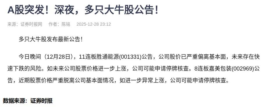 最近市场有点热闹,好几只连续涨停的“大牛股”在12月28日晚间集体发布公告,提示风险。比如11连板的胜通能源、8连板的嘉美包装,都直言股价已严重偏离基本面,存在快速下跌风险,甚至可能申请停牌核查。浙江世宝、神剑股份等也纷纷发布股价异动公告,强调经营环境未发生重大变化。