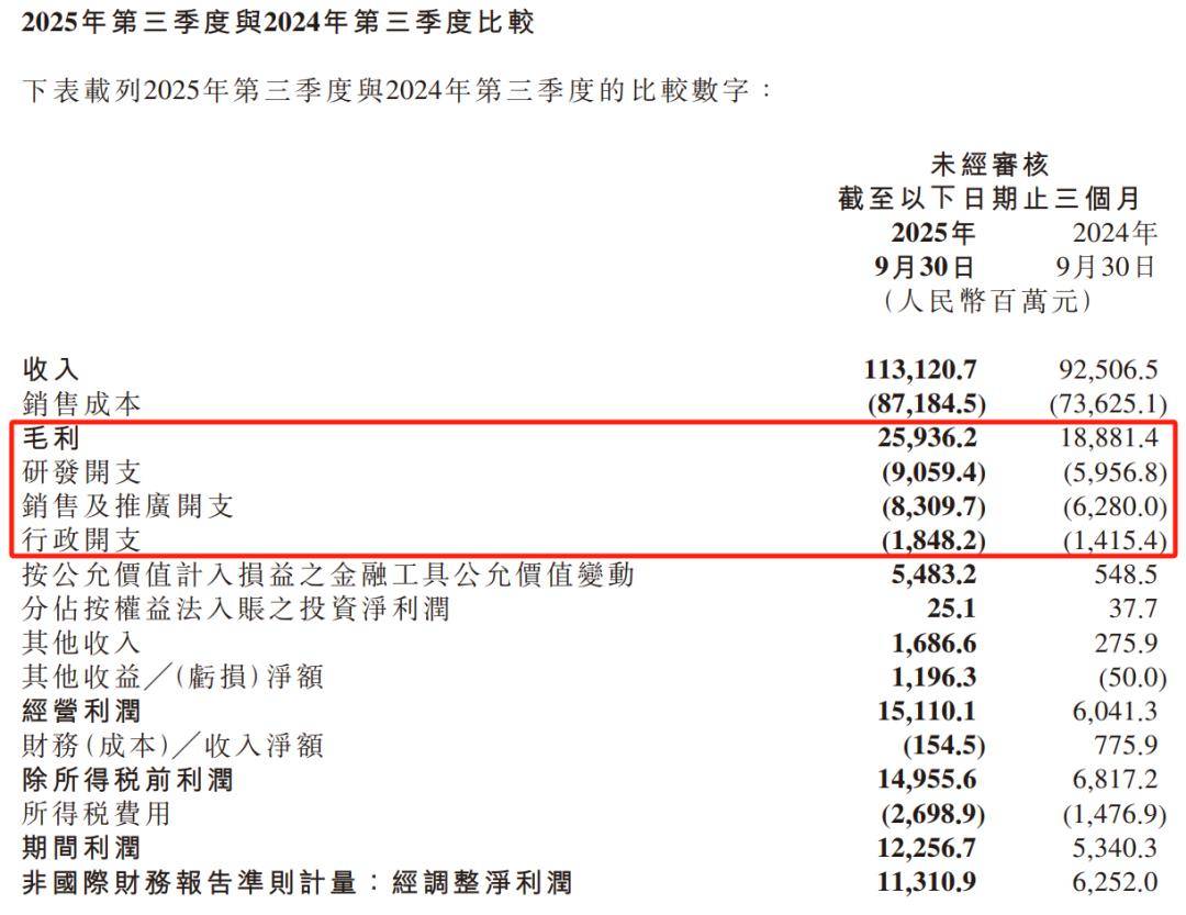 2025 年第三季度,小米交付了 10.9 万辆新车,创历史新高。其中包括 6 月发布的小米 YU 7 以及 SU 7 产能提升,小米的智能电动汽车收入从去年同期的 97 亿元增长至本期的 283 亿元。其他相关业务收入( 售后及汽车金融服务收入 )也从 2 亿元增长到 7 亿元。